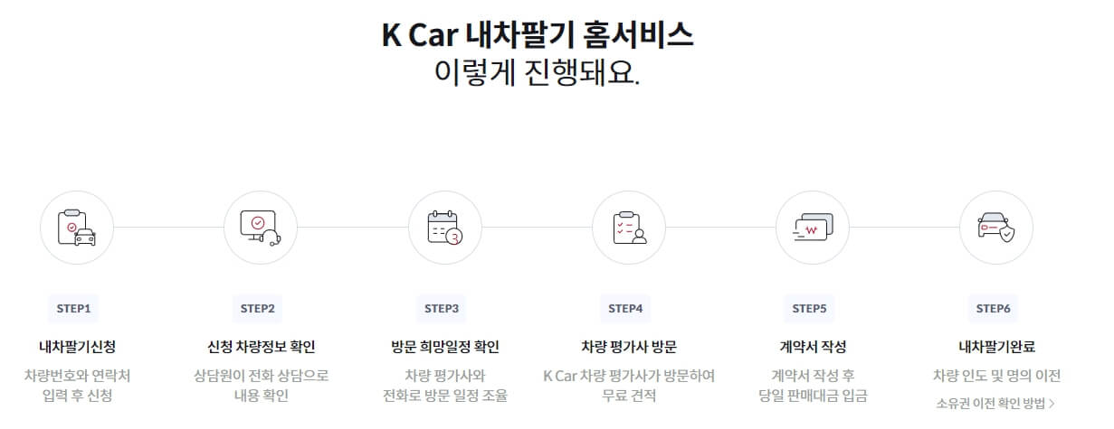 - 하루 만에 내차팔기 : K Car가 차량 판매의 모든 과정으로 직접 진행하기 때문에 방문견적부터 소유권 이전까지 하루 만에 끝낼 수 있습니다.